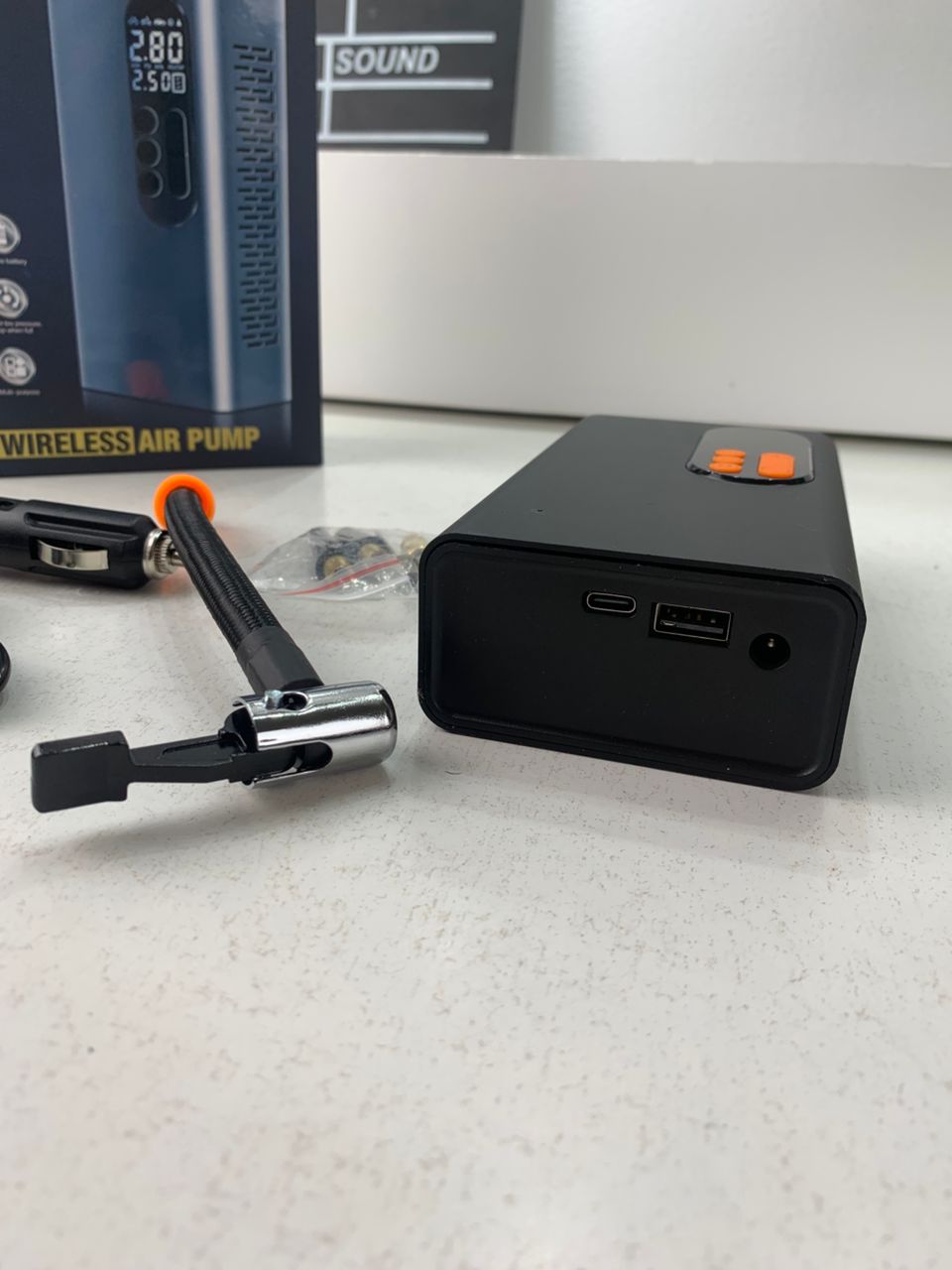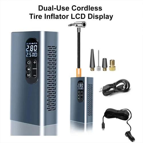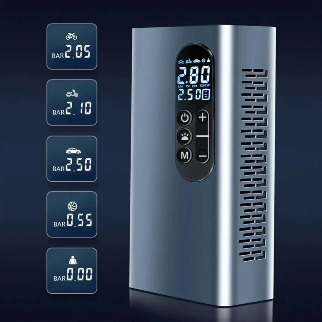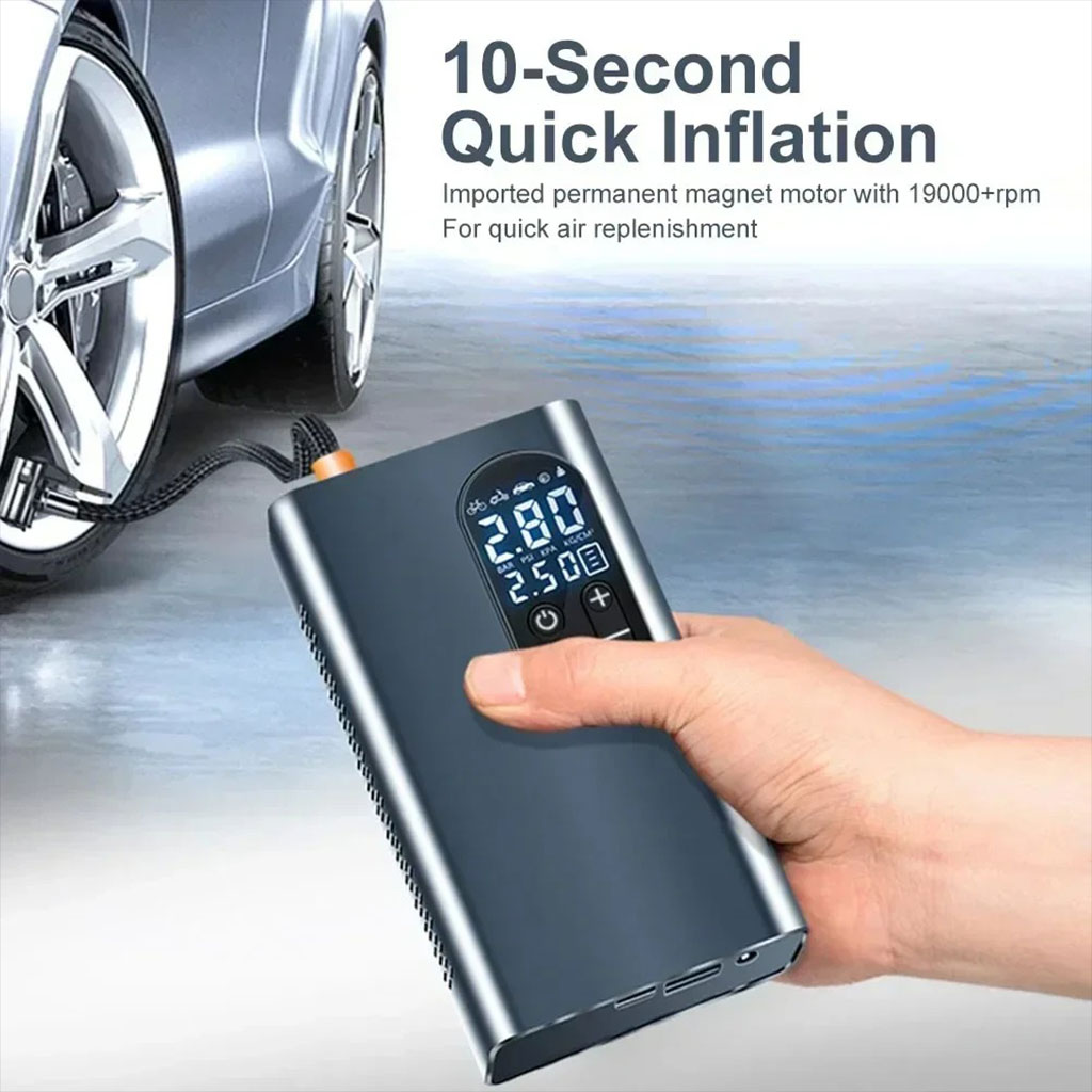 ماكاش قلق على الطريق مع هاد الكمبريسور الذكي! يجيك ببطارية قوية 6000mAh قابلة للشحن + كيما يفرغ، تقدر تستعملو مباشرة مع ولاعة السيارة 12V. مثالي للسيارات، الموتورات، الدراجة وحتى الكورات والأغراض القابلة للنفخ.