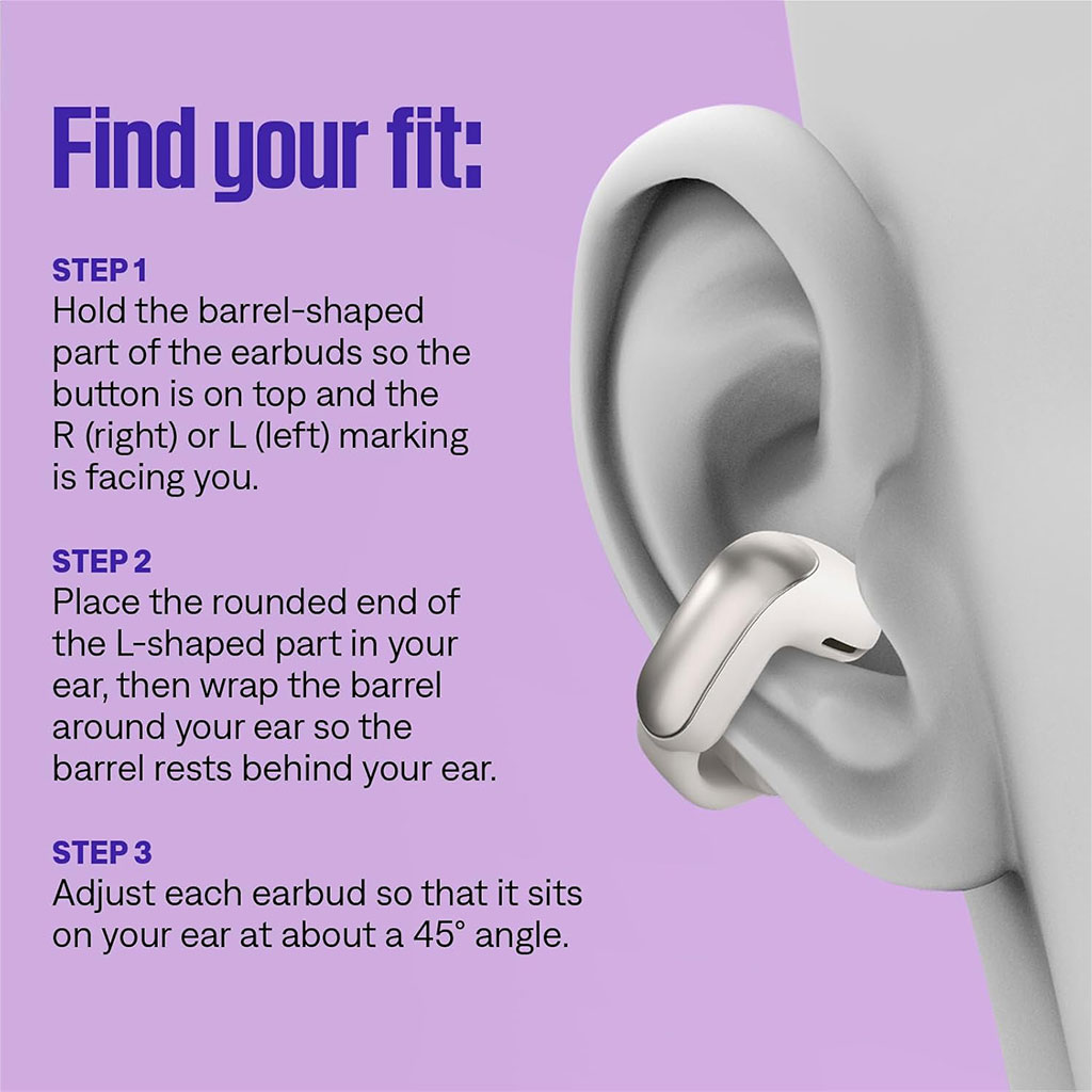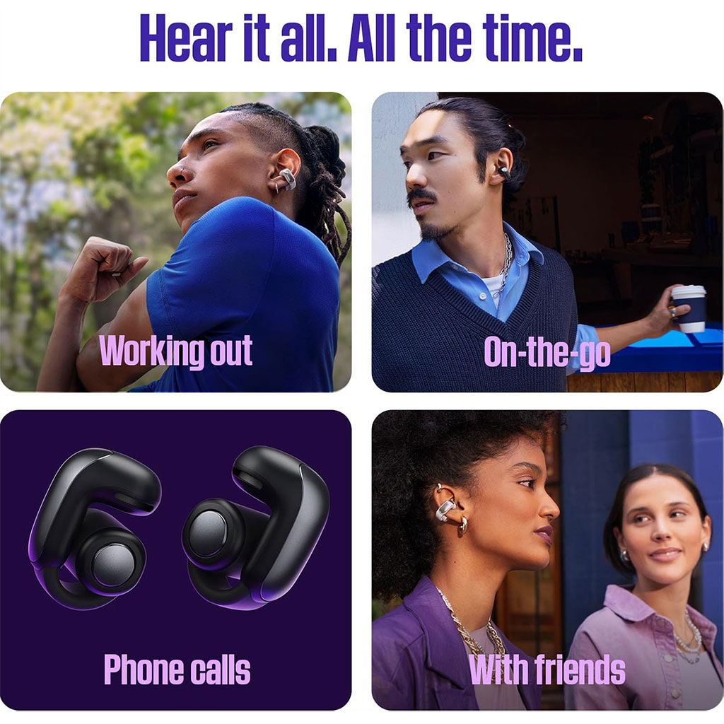 ⭐ المميزات الرئيسية :👂 تصميم مفتوح على العالم : اسمع محيطك وفي نفس الوقت استمتع بصوت خاص بجودة عالية بفضل تقنية OpenAudio.🌌 صوت غامر ثلاثي الأبعاد : تقنية Bose Immersive Audio تخليك تحس بروحك داخل الموسيقى مش غير تسمعها.🪶 راحة لا مثيل لها : خفيفة جدًا، بتصميم مرن يلتف بلطف خلف الأذن ويبقى ثابت طول اليوم.🌧️ مقاومة للماء IPX4 : تتحمل الرذاذ، المطر والعرق بفضل طبقة شبكية تحمي من الرطوبة والأوساخ.🔋 بطارية طويلة الأمد :حتى 7 ساعات تشغيل (4 ساعات مع الصوت الغامر).حتى 48 ساعة في وضع الاستعداد.علبة الشحن توفر حتى 2.5 شحنات إضافية.📲 اتصال Bluetooth متعدد النقاط : تبدل بسهولة بين الهاتف، الكمبيوتر أو أي جهاز آخر بدون انقطاع.🎛️ تحكم بسيط وسريع : أزرار مدمجة للتحكم في الصوت، الرد على المكالمات والتبديل بين الوضعيات بسهولة.📦 محتوى العلبة :