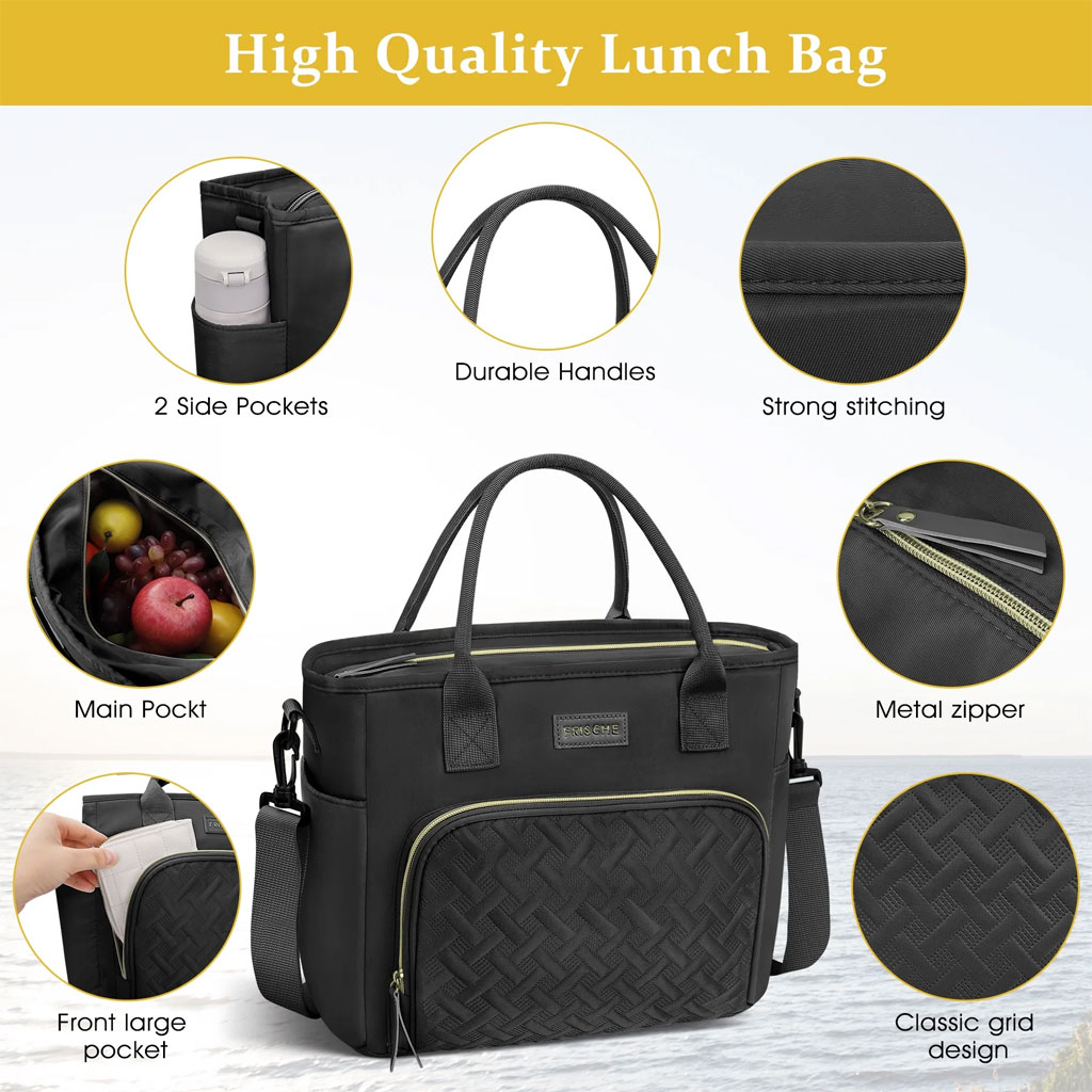 الماركة : FRISCHEاللون : أسودالمادة : قماش Oxfordالسعة : 18 لترالوزن : 400 غرامالأبعاد : 28 × 33 × 15 سم🥗👜 حقيبة غداء عصرية للنساء – كبيرة، أنيقة وعازلة للحرارة 👜🥗
