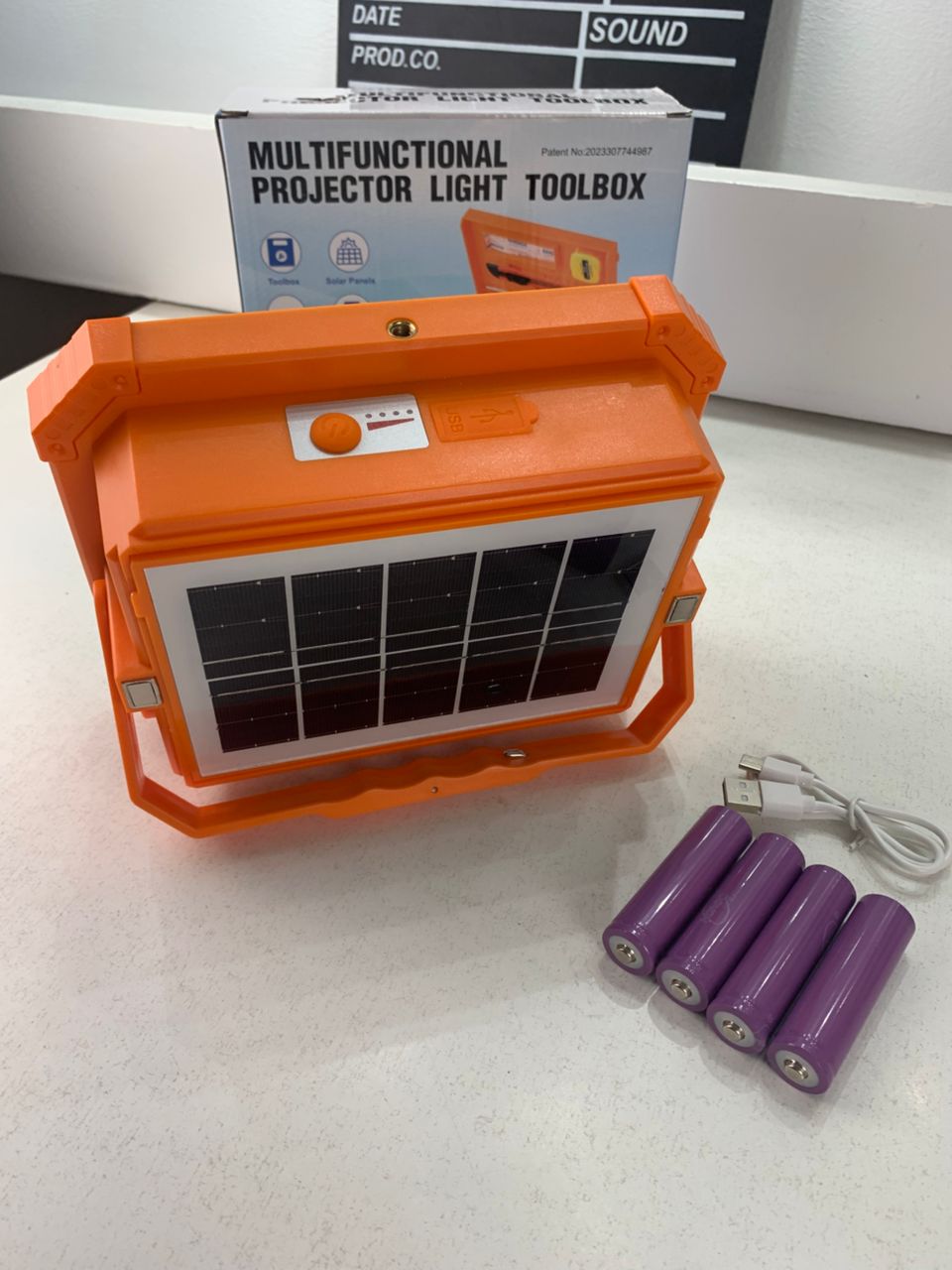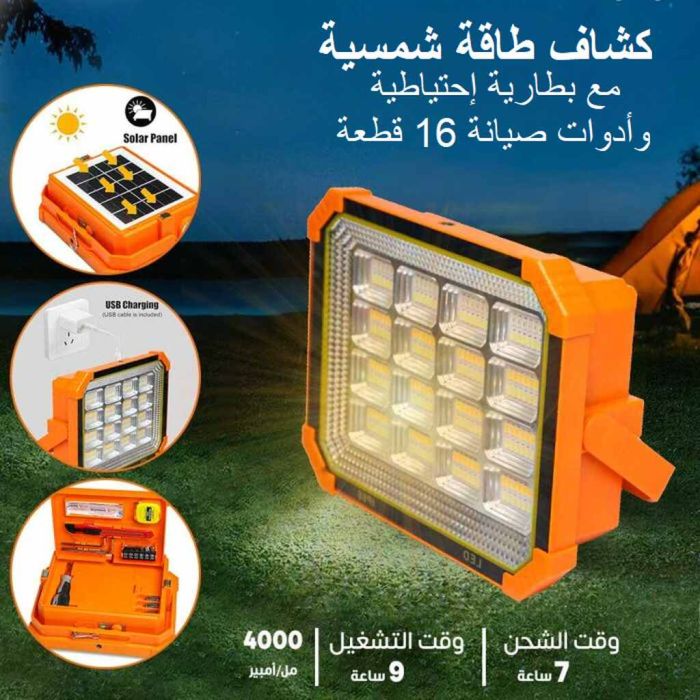 ⭐ المميزات الرئيسية :💡 إضاءة فائقة : قوة تصل حتى 10000 لومن لإضاءة واسعة وواضحة.🔋 بطارية 4000 mAh قابلة للشحن + لوحة شمسية، تدوم حتى 9 ساعات من الاستخدام.🔌 باور بانك مدمج : اشحن هاتفك أو أجهزتك عبر USB.☀️ مرونة في الشحن : شحن بالطاقة الشمسية (≈7 ساعات) أو عبر USB.🚨 3 أوضاع إضاءة : قوية – ضعيفة – SOS للطوارئ.🛠️ 16 أداة صيانة مدمجة (مفك، كماشة، متر …) في قاعدة الكشاف.🧲 تثبيت عملي : بفضل الحامل المدمج، الخطاف والمغناطيس.🌧️ مقاومة قصوى : معيار IP66 ضد الماء، الغبار والصدمات.📏 الأبعاد : 21,3 × 17,3 × 7 سم | 🪨 المواد : ABS + زجاج مقوّى.
