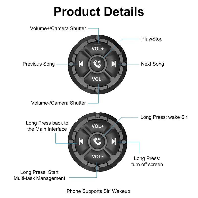 ⭐ المميزات الرئيسية :📡 اتصال بلوتوث لاسلكي : اقتران سريع وسهل مع جهازك في نطاق يصل حتى 10 أمتار.🎵 تحكم كامل بالوسائط : تشغيل/إيقاف الموسيقى، التقديم، الإرجاع، رفع وخفض الصوت بلمسة واحدة.💤 وضع توفير الطاقة : يتوقف تلقائيًا بعد دقيقة من عدم الاستخدام، ويعود للعمل بلمسة زر.🚴 تثبيت عملي : مع الحامل المرفق يمكنك تركيبه على مقود الدراجة أو السيارة لإبقاء يديك آمنتين وعينيك على الطريق.📱 توافق واسع : يدعم معظم الأجهزة العاملة بـ Bluetooth 5.3+، متوافق مع iPhone (iOS 7.0+) و Android (4.4+).🔋 عمر بطارية طويل :مزود ببطارية CR2023 تدوم حتى عام كامل بفضل وضع توفير الطاقة الذكي.